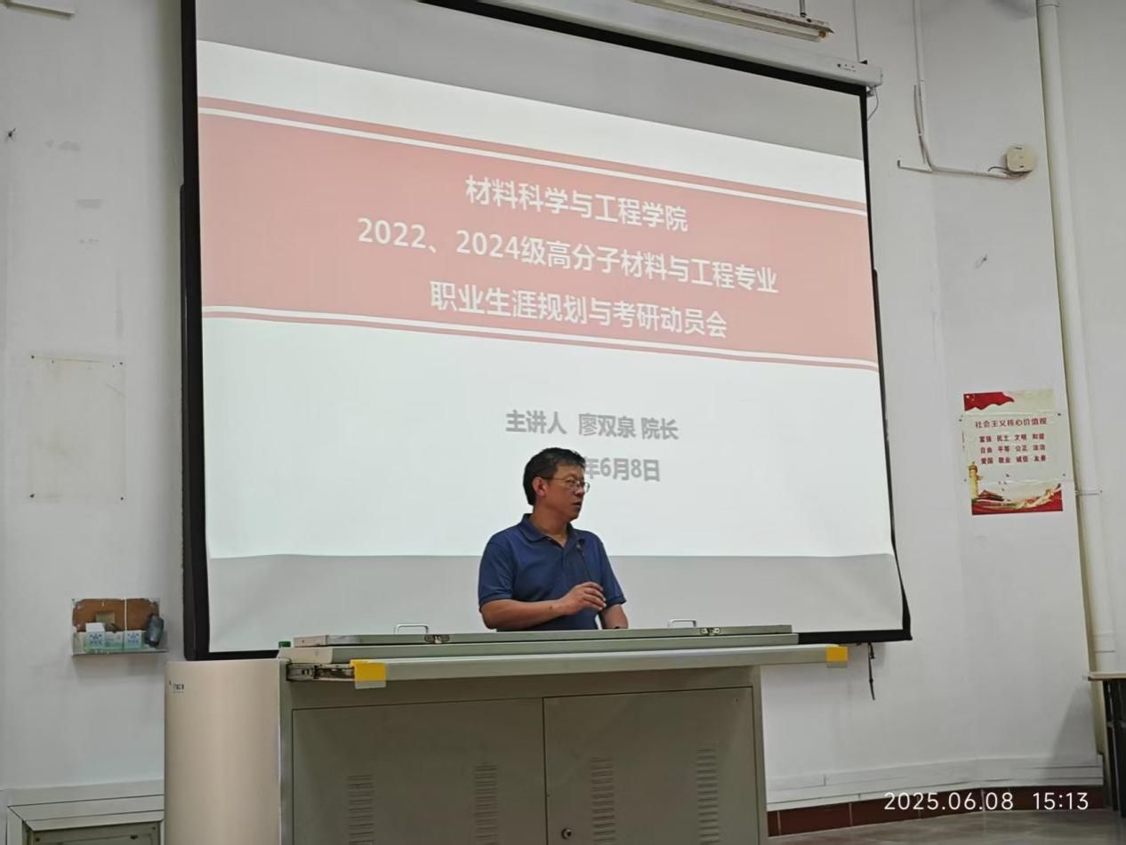 2025年6月8日下午,太阳成集团tyc33455cc在2教108教室举办面向2022、2024级高分子材料与工程专业同学的职业生涯规划与考研动员活动。本次活动由高分子材料科学与工程专业责任教授廖双泉教授主讲,2024级高分子材料与工程专业全体同学及班主任、2022级高分子材料与工程专业同学参与,由兼职辅导员刘纪泽老师主持。