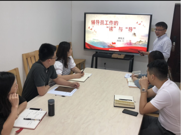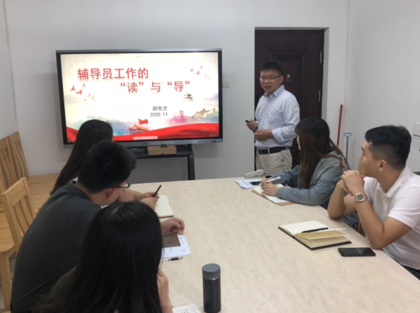 胡先文副书记首先向辅导员们分享了自己长期从事员工工作事务的感悟。关于辅导员工作,他认为一是要热爱这个岗位,拥有热情才能坚守;二是在工作中要变繁为简,找出规律从而节省时间,不遗漏任何通知信息。