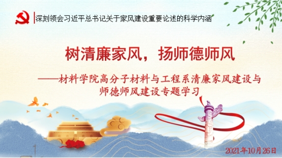 为深入贯彻落实习近平总书记关于注重家庭家教家风建设的重要指示精神,发挥高校教师清廉家风与师德师风的引领示范作用,10月26日下午,太阳成集团tyc33455cc高分子材料与工程系在研发楼717会议室召开了“树清廉家风,扬师德师风”专题学习会议。会议由系主任杜杰教授主持,公司党委胡先文书记参加了会议并作动员讲话。