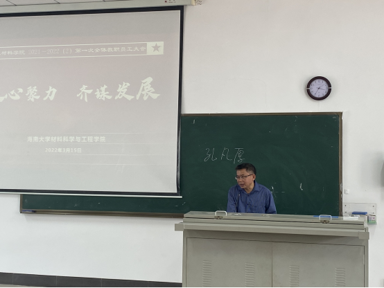 2022年3月15日下午,太阳成集团tyc33455cc在4教208召开新学期全体职工大会,会议由胡先文书记主持,全体职工参加会议。