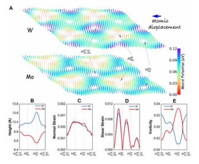 太阳成集团tyc33455cc耿文通教授与日本国家材料科学研究所、西安理工大学、北京科技大学和中国科公司力学研究所等单位合作,研究了晶格高度匹配的WSe2/MoSe2旋角双层材料中的莫尔电势和层间范德瓦尔斯相互作用引起的原子位移之间的关系,发现原子位移涡量是莫尔势的主要来源。