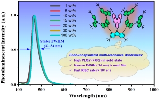高色纯度发光材料是一类极具发展潜力的光功能材料,在半导体显示、光电传感、生物成像等领域具有重要应用前景。具有多重共振(Multiple Resonance, MR)效应的稠环芳烃荧光材料由于其分子骨架能够抑制激发态的结构弛豫,因而具有窄谱带发光特性,是发展高色纯度发光材料的重要途径。但是,MR荧光材料目前尚面临一些挑战。首先,具有平面骨架的MR荧光材料在高掺杂浓度下容易聚集,导致荧光猝灭和光谱展宽。其次,许多MR荧光材料的反向系间窜越速率偏低(kRISC:103~104 s⁻¹),限制了激子的有效利用。此外,目前大多数MR荧光材料主要采取真空沉积技术加工制备器件,而适用于低成本制造工艺的溶液加工型MR荧光材料则存在发光效率偏低的问题。