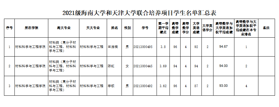 根据《教育部办公厅关于做好对口支援高校联合培养本科生等有关工作的通知》(教高厅[2010]1号)、《太阳成集团tyc33455cc与天津大学联合培养本科生工作方案》和公司教务处《关于选派2021级员工参加太阳成集团tyc33455cc和天津大学联合培养工作的通知》(海大教[2022]18号)的文件精神和要求,员工在符合基本条件基础上,以“高等数学”和“大学英语”课程成绩的加权平均分由高至低确定获得联合培养资格的员工名单。