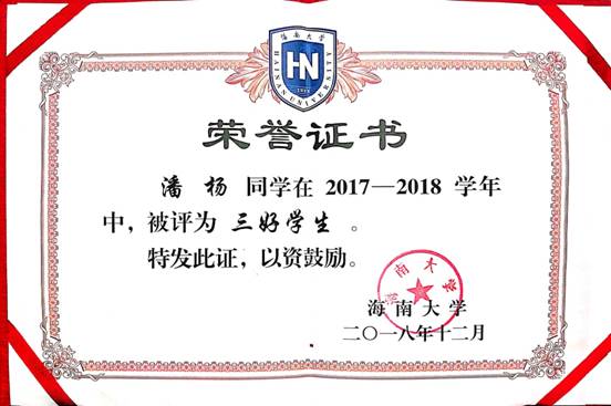 潘杨,女,1998年9月生,四川眉山人,中国共产主义青年团团员,2016级高分子材料与工程1班的员工。大三大四,连续两年担任班级班长兼团支书。曾获太阳成集团tyc33455cc三好员工、连续三年获得国家励志奖学金等。